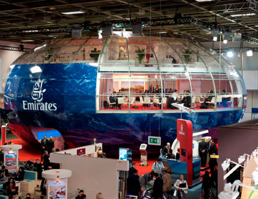 وتشارك طيران الإمارات في معرض بورصة السفر العالمية في برلين هذا العام بجناحها الشهير المصمم على شكل كرة أرضية دوارة، الذي يعرف باسم عالم الإمارات Emirates Globe، وتم تعديل الجناح خصيصاً هذا العام ليبرز التجهيزات والخدمات المتوفرة على طائرات طيران الإمارات من طراز أ380. فقد أضيف إليه وحدة شاور سبا وصالون جوي بالحجم الحقيقي، ما يتيح للآلاف من زوار المعرض والجناح تجربة ما توفره الطائرة العملاقة ذات الطابقين.