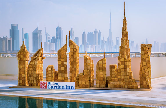 احتفلت ’هيلتون العالمية‘بوصول علامتها التجارية ’هيلتون جاردن إن‘ متوسطة التكلفة والحائزة العديد من الجوائز إلى الإمارات العربية المتحدة، وكشفت النّقاب عن مجسّمٍ قابلٍ للأكل لمشهد من مدينة دبي مصنوع من كعكات الوافل الموسومة برمز العلامة التجارية المميزة.