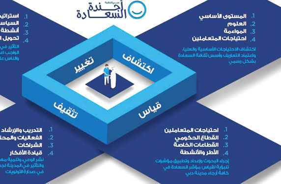 كما أن مبادرة (أبطال السعادة)، التي أطلقها المكتب في أكتوبر الماضي، تعد من عوامل تحقيق (أجندة السعادة) التي أعلنها صاحب السمو الشيخ محمد بن راشد آل مكتوم، نائب رئيس الدولة رئيس مجلس الوزراء حاكم دبي، في شهر مايو الماضي، وتهدف المبادرة إلى توحيد مفاهيم السعادة وحاجاتها على مستوى المدينة من منظور علمي، ما يؤدي إلى جعل المدينة أكثر كفاءة وتكاملاً وتأثيراً، وتلك من الركائز الأربع الأساسية في المدن الذكية.