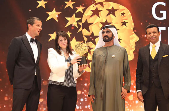 كرّم صاحب السمو الشيخ محمد بن راشد آل مكتوم نائب رئيس الدولة رئيس مجلس الوزراء حاكم دبي المعلمة الكندية "ماغي ماكدونال" الفائزة بجائزة المعلم العالمية وقدرها مليون دولار اميركي.