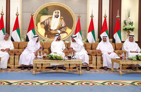 استقبل صاحب السمو الشيخ محمد بن راشد آل مكتوم، نائب رئيس الدولة رئيس مجلس الوزراء حاكم دبي، وصاحب السمو الشيخ محمد بن زايد آل نهيان، ولي عهد أبوظبي نائب القائد الأعلى للقوات المسلحة، بقصر المشرف مساء أمس، أصحاب السمو أعضاء المجلس الأعلى حكام الإمارات، وسمو أولياء العهود، ونواب الحكام.