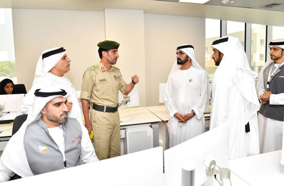 وأثناء جولة صاحب السمو الشيخ محمد بن راشد آل مكتوم، في ردهات وأقسام المبنى الصرح الذي يتألف من ستة أدوار، شاهد سموه خريطة إلكترونية لمكونات وتصاميم المبنى الذي تصل مساحته الإجمالية إلى نحو 11 ألف متر مربع، حسب الشرح الذي قدمه أحد المهندسين في المركز، الذي أضاف أن المركز يضم خمس غرف تحكم فرعية لمختلف الاستخدامات، بالإضافة إلى الغرفة الرئيسة التي تقدر مساحتها بنحو 430 متراً مربعاً وارتفاعها 13 متراً، ويضم كذلك مهبطاً للطائرات العمودية وقاعتين ذهبية وفضية يطلان على غرفة التحكم الرئيسة ومدعمتين بخاصية الوصول إلى بيانات نظام النقل الجماعي والنظام المروري لإتاحة المجال لفريق القيادة باتخاذ القرارات المناسبة بنجاح في حالات الطوارئ والأزمات.