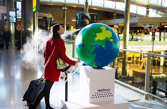 وقد ذكرت تقارير صحافية أنه بات بإمكان الركاب في المبنى الجديد في مطار هيثرو الانتقال إلى أي الوجهات التي يفضلونها بأنوفهم في “استنشاقة واحدة”، حيث ابتكر المطار طريقة جديدة تسمى ” رائحة العالم” وهي عبارة عن مجسم للكرة الأرضية يمكن للمسافر من خلاله الضغط على وجهته القادمة لتنبعث الرائحة المميزة لهذه الوجهة، ومن ثم يسافر الراكب في رحلة حسية قبل أن تطأ قدمه المكان المقصود.